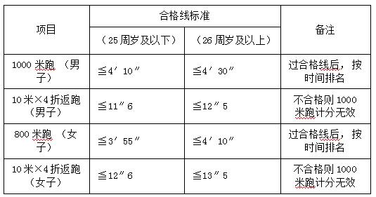 體能測(cè)試項(xiàng)目:男子1000米跑、女子800米跑,4×10米往返跑。測(cè)試標(biāo)準(zhǔn)參照《公安機(jī)關(guān)錄用人民警察體能測(cè)評(píng)項(xiàng)目和標(biāo)準(zhǔn)(暫行)》適當(dāng)放寬。